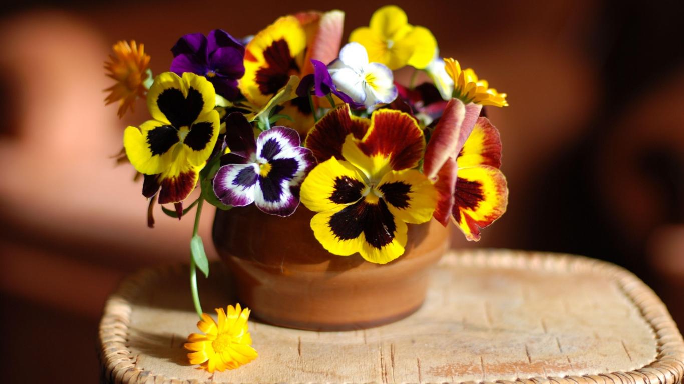 Обои Букет цветов анютины глазки в вазе