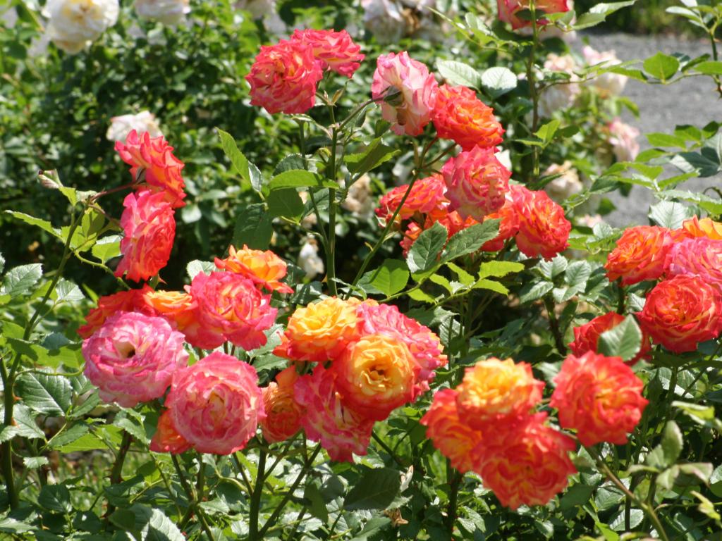 Обои Красивые разноцветные садовые розы на клумбе