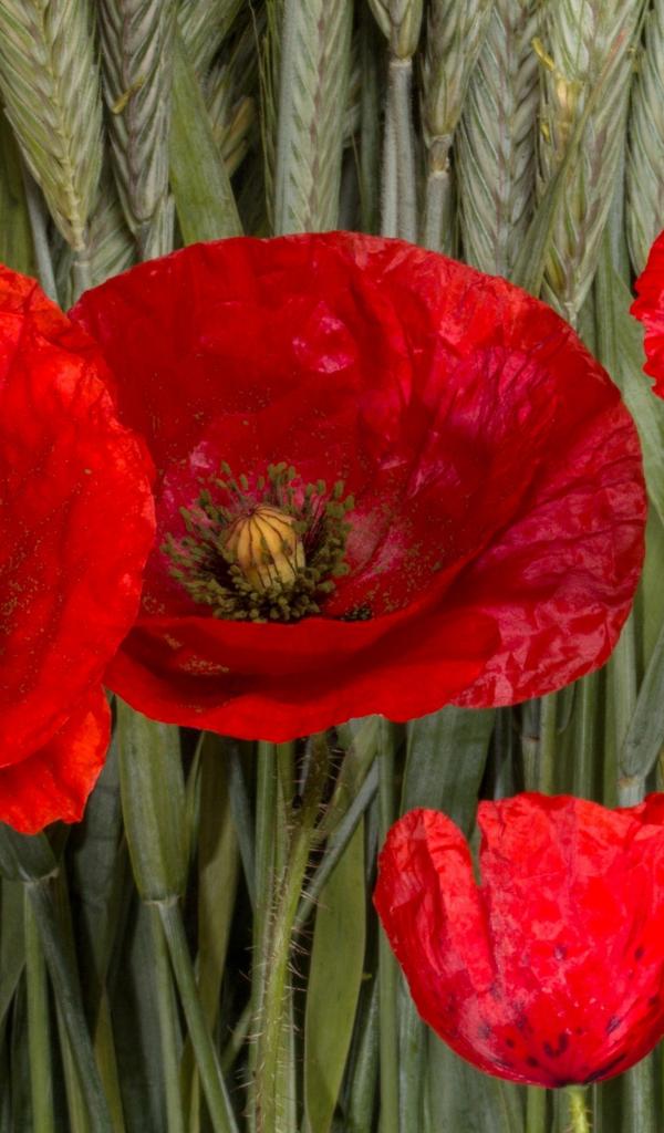 Обои Красные цветы мака на зеленых колосках пшеницы