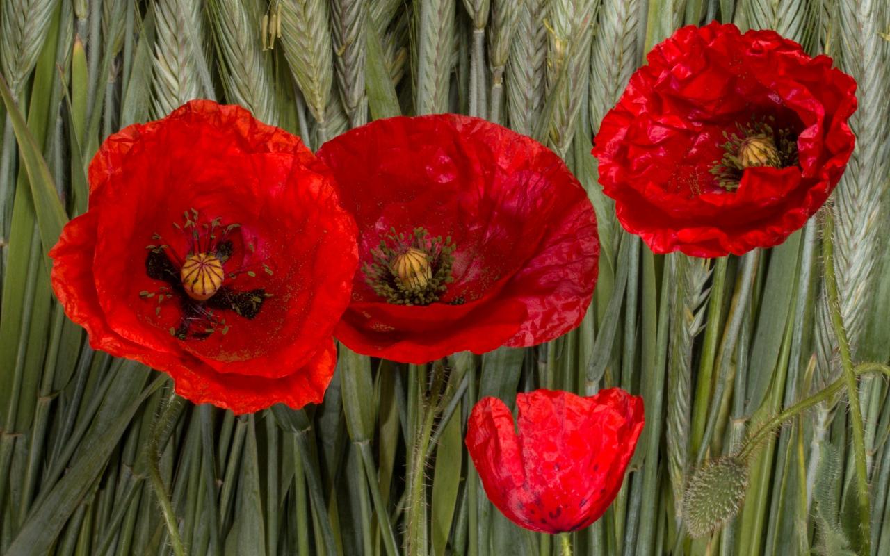 Обои Красные цветы мака на зеленых колосках пшеницы