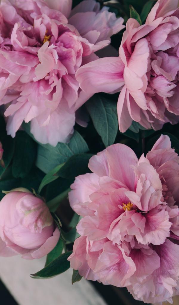 Обои Розовые цветы пиона на деревянной лавке