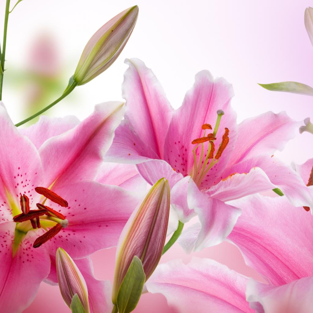 Обои Две красивые нежные белые лилии с бутонами крупным планом