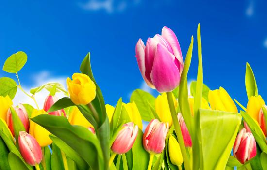 Обои Желтые и розовые тюльпаны на фоне голубого неба