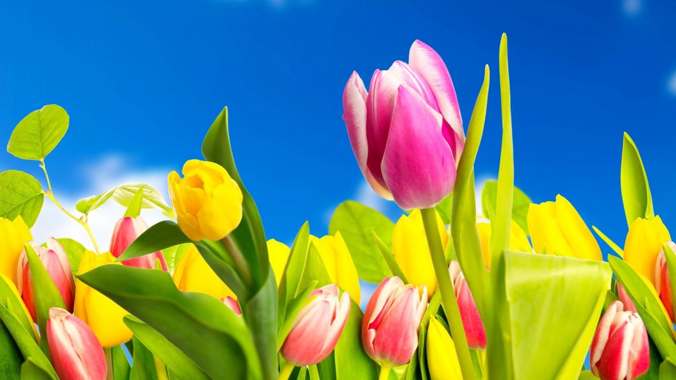 Обои Желтые и розовые тюльпаны на фоне голубого неба
