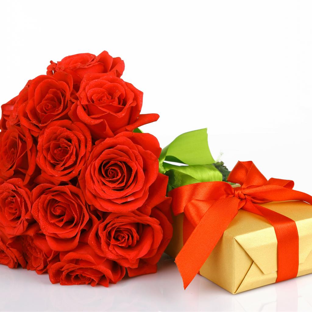 Обои Букет красных роз с подарком на белом фоне