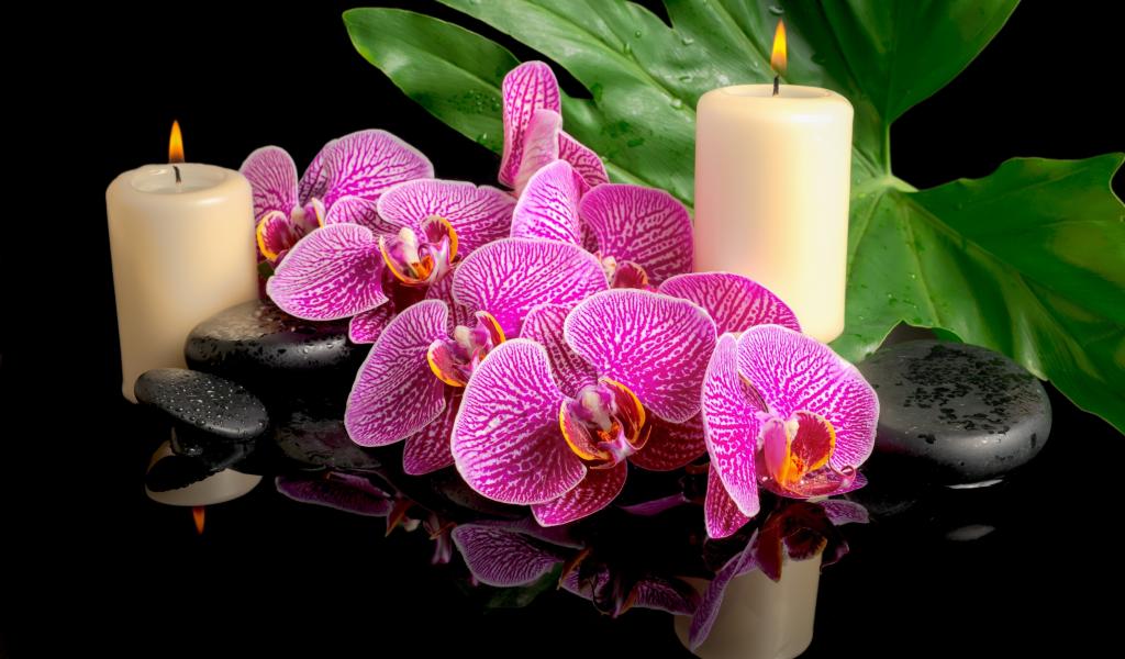 Обои Розовые орхидеи с черными камнями и зажженными свечами