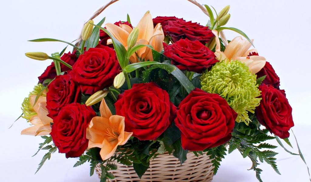 Обои Корзина с цветами красной розы и лилии