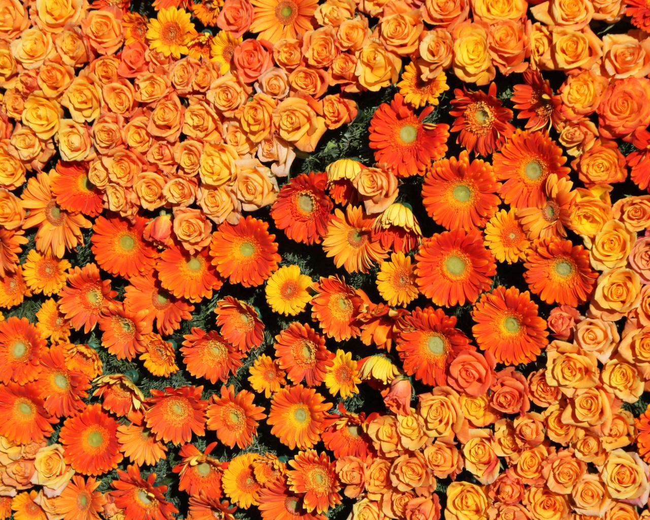 Обои Оранжевые розы и герберы вид сверху