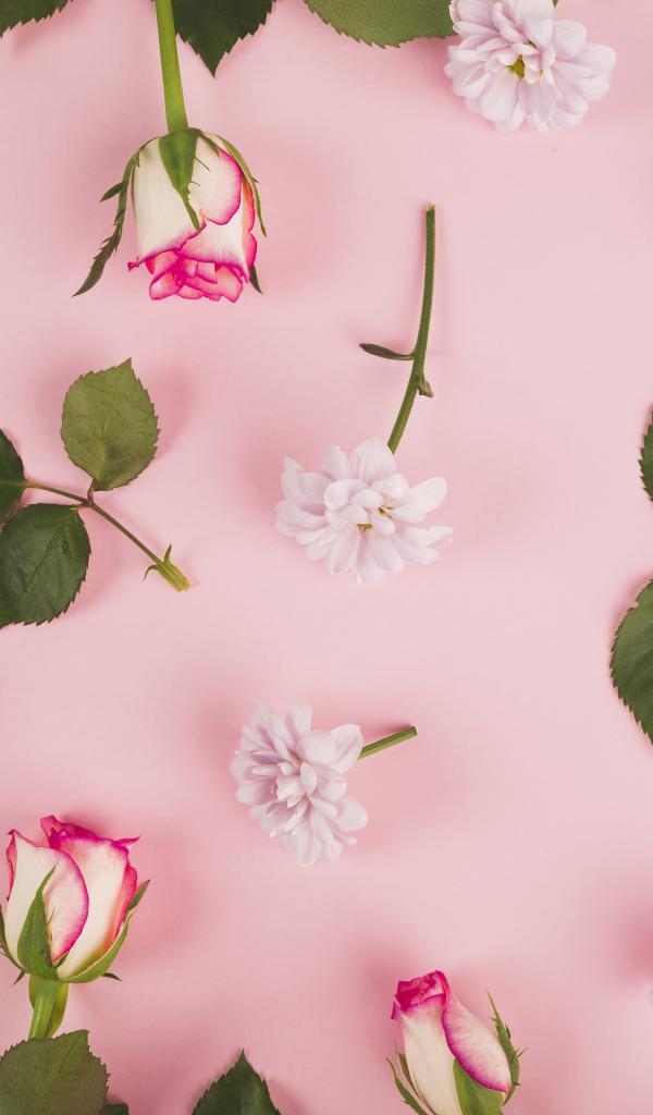 Обои Розовые розы и хризантемы на розовом фоне