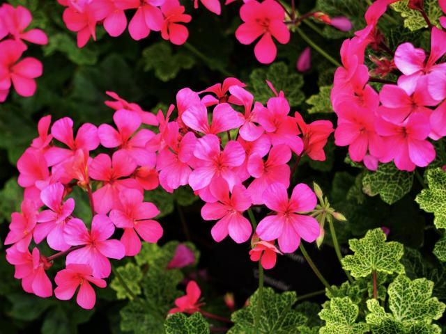 Обои Розовые цветы герани с зелеными листьями