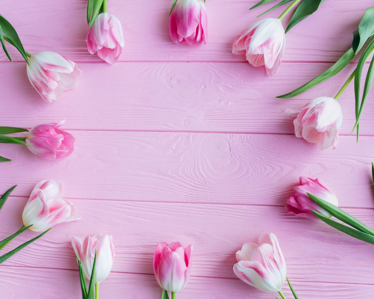 Обои Розовые тюльпаны с зелеными листьями на розовом фоне