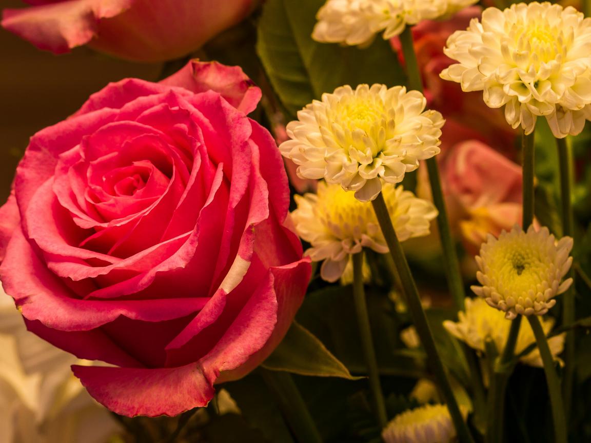 Обои Красивая розовая роза с белыми хризантемами