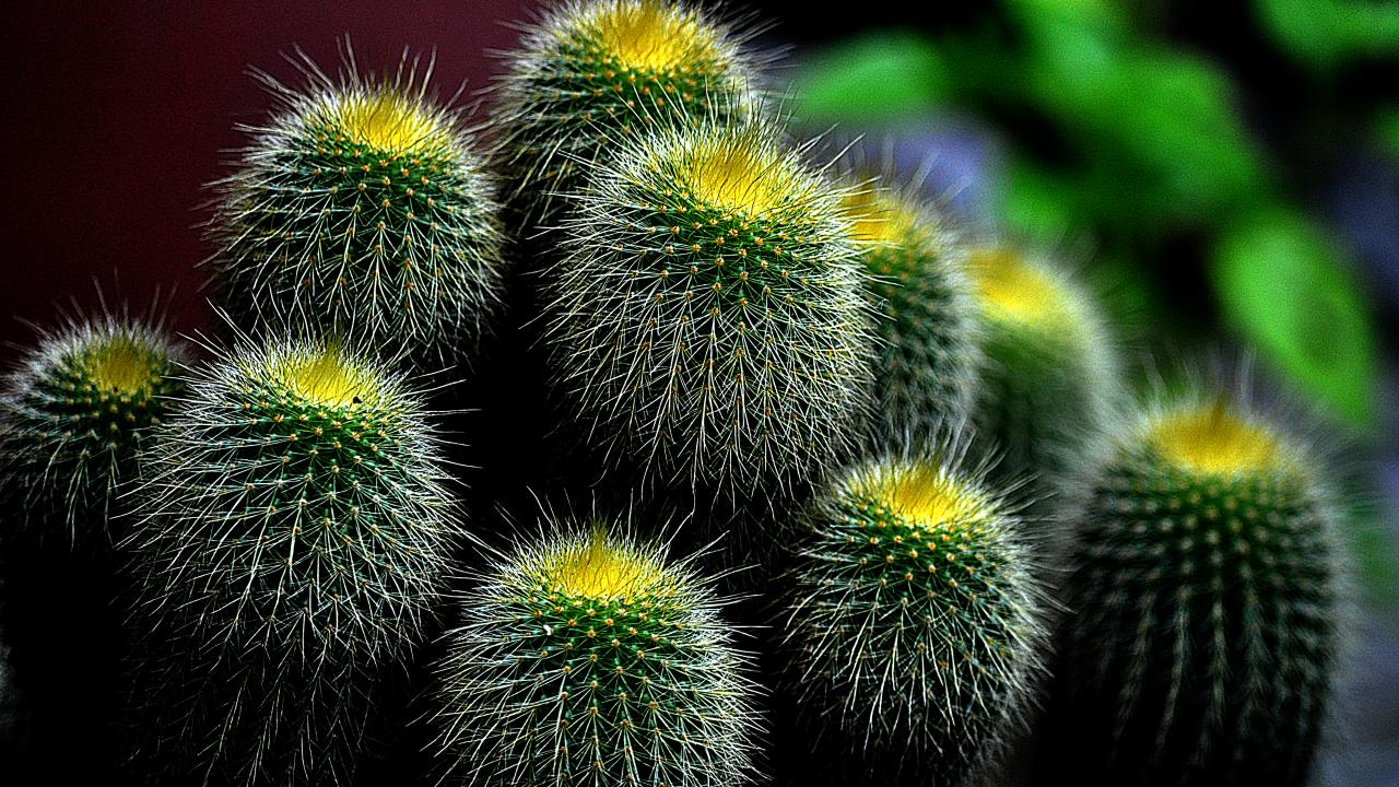 Обои Зеленый цветущий оранжевыми цветами кактус на черном фоне