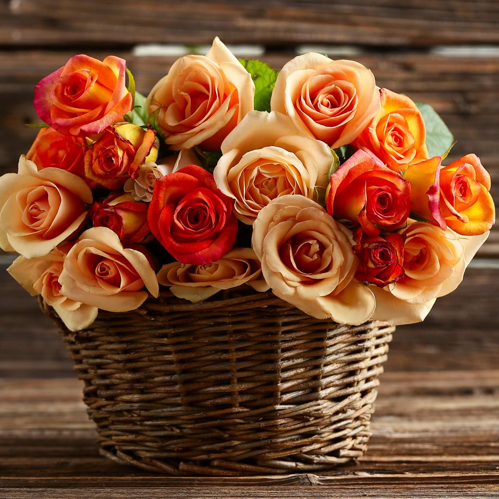 Обои Букет оранжевых и желтых тюльпанов в корзине