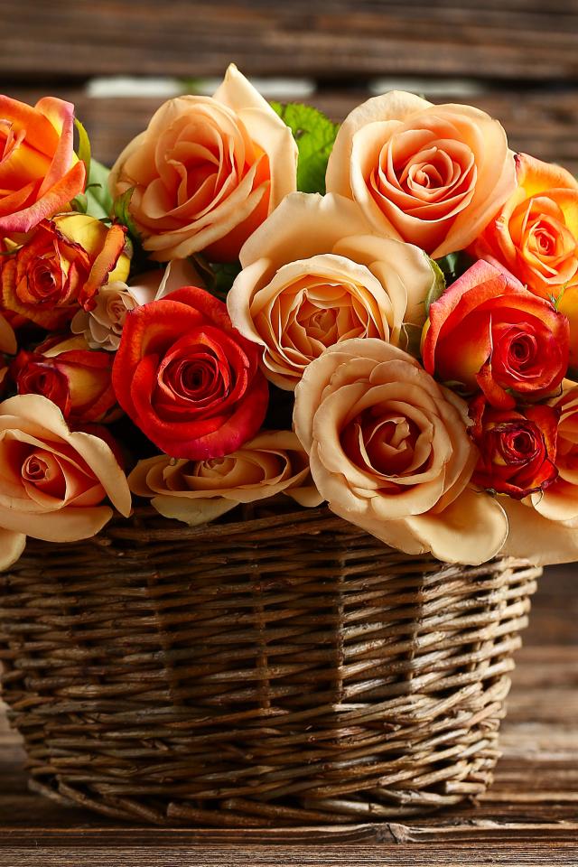 Обои Букет оранжевых и желтых тюльпанов в корзине