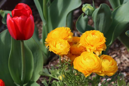 Обои Красный тюльпан и желтые лютики на клумбе