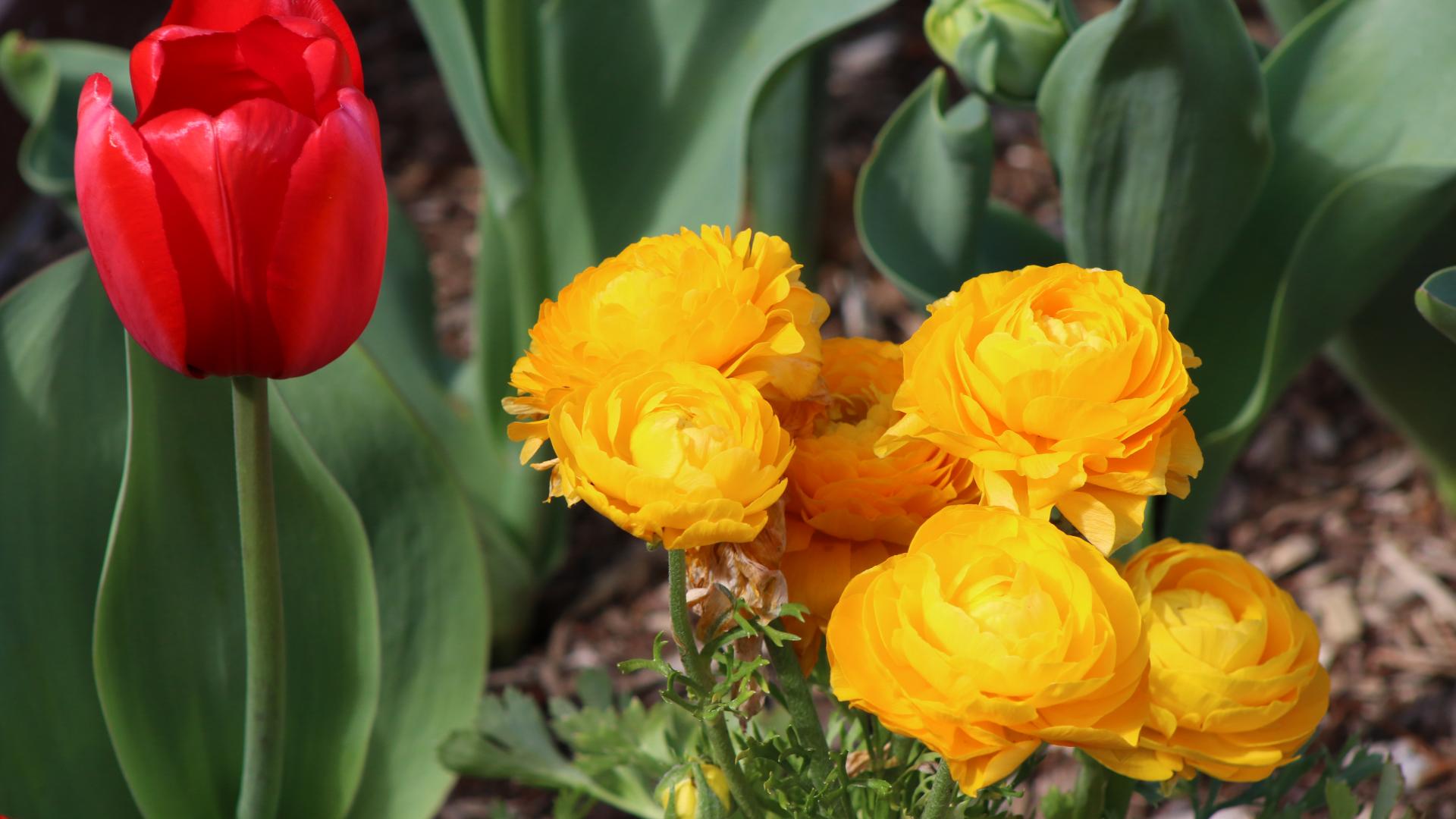 Обои Красный тюльпан и желтые лютики на клумбе