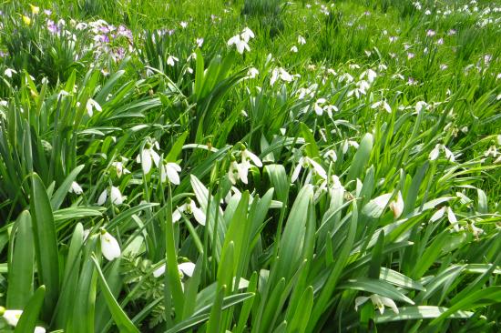 Обои Много белых подснежников с зелеными листьями