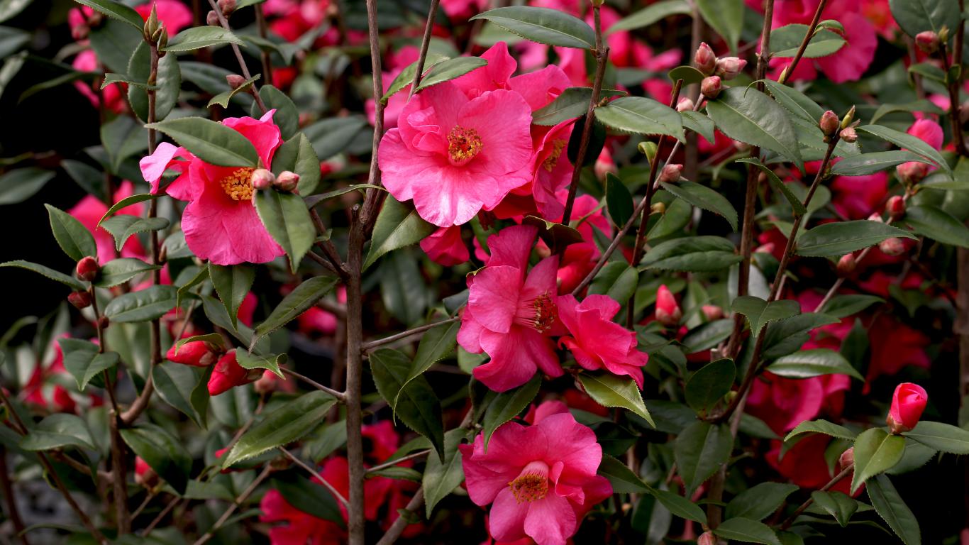Обои Розовые цветы с зелеными листьями на ветке на голубом фоне