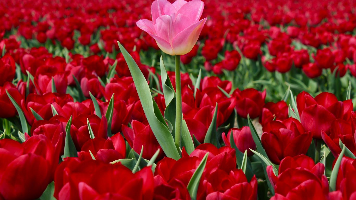 Обои Розовый тюльпан на поле с красными тюльпанами