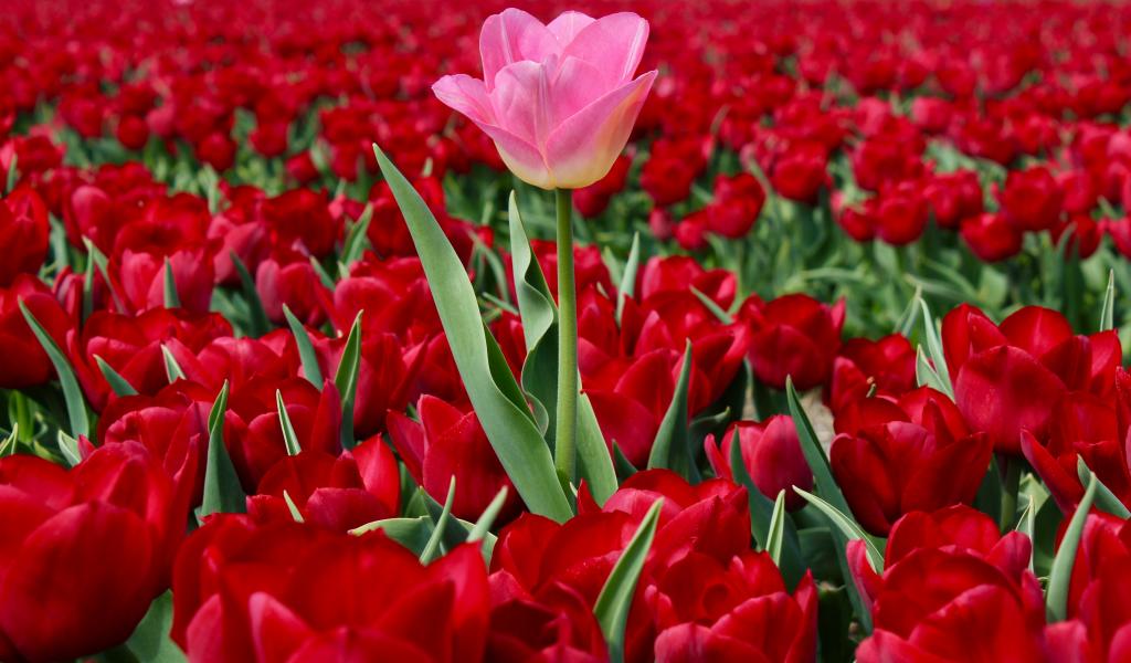 Обои Розовый тюльпан на поле с красными тюльпанами