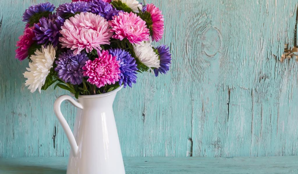 Обои Разноцветные астры в вазе на деревянном фоне