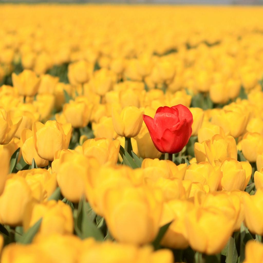 » Обои Красный тюльпан на поле с желтыми тюльпанами