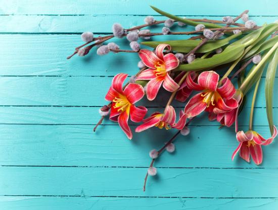 Обои Тюльпаны с веточками вербы на голубом фоне