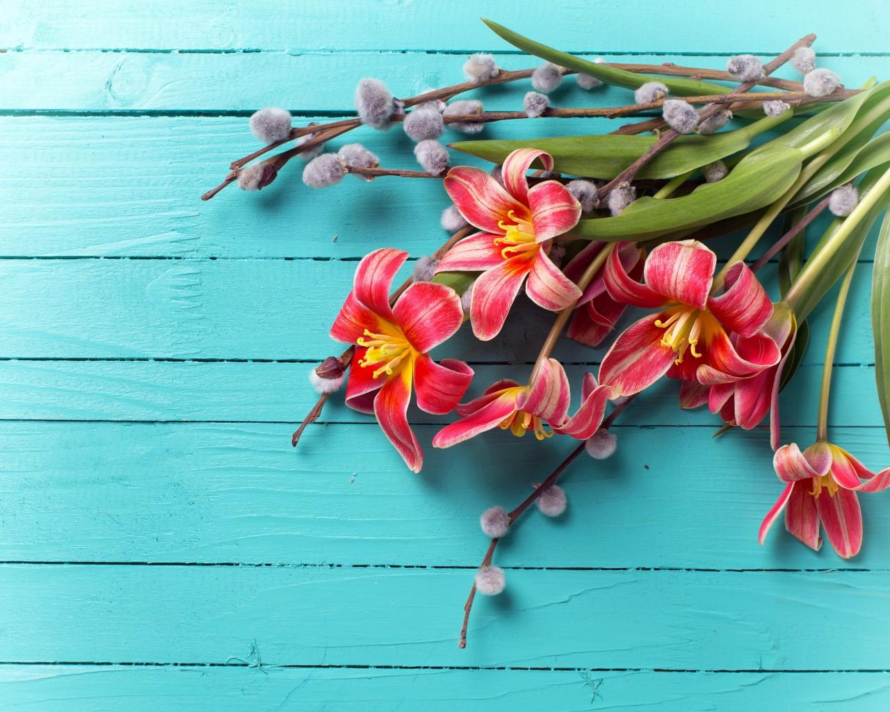 » Обои Тюльпаны с веточками вербы на голубом фоне