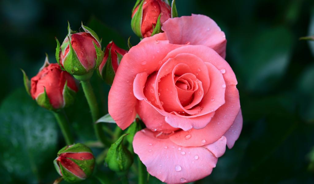 Обои Розовый цветок розы с бутонами в каплях росы