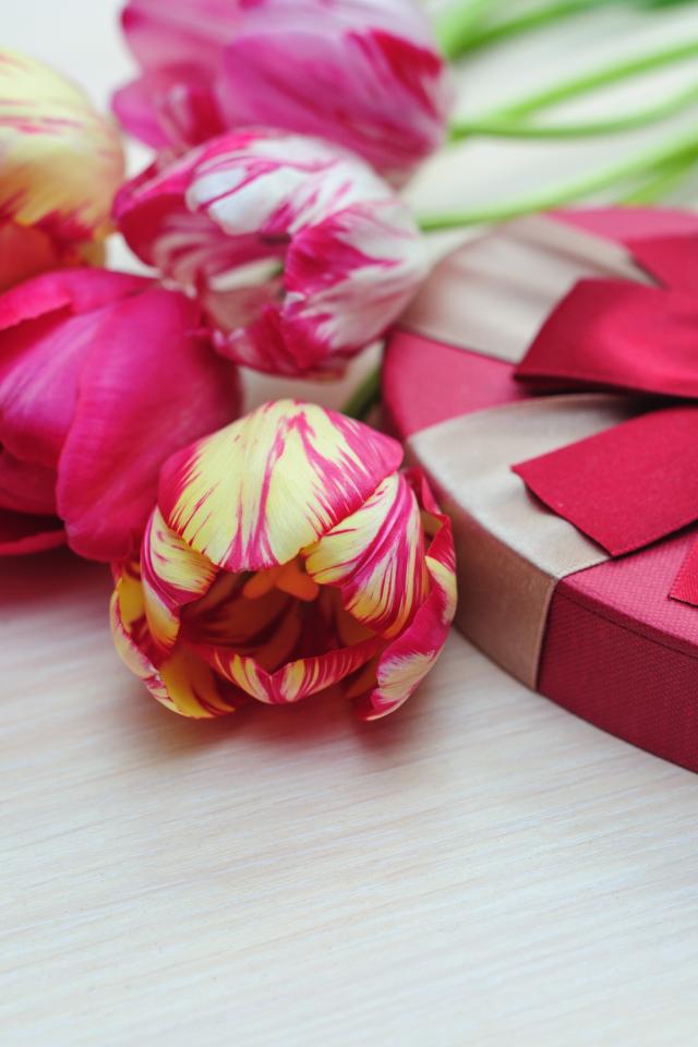 Обои Букет тюльпанов и коробка конфет в подарок