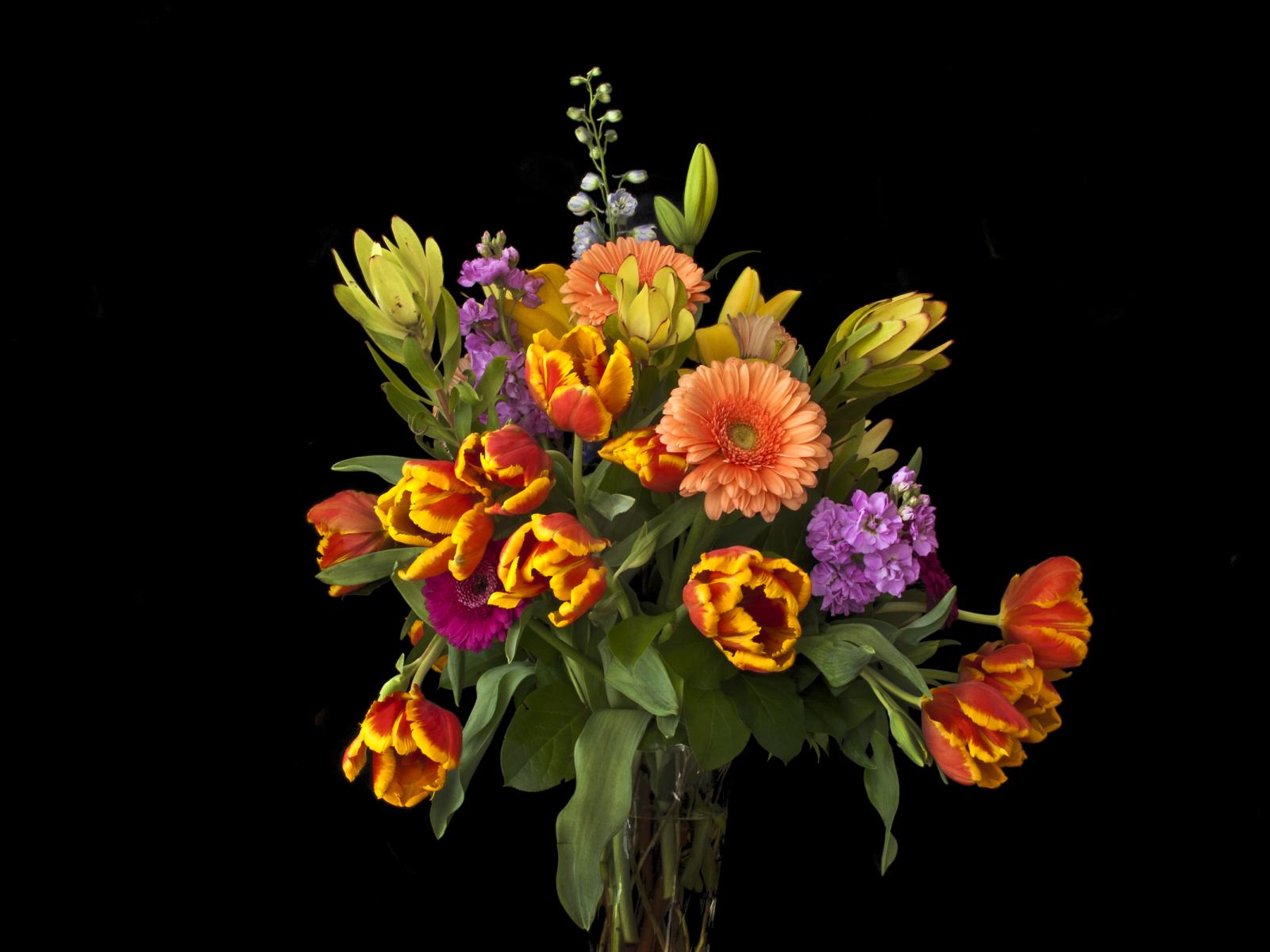 Обои Букет тюльпанов с цветами герберы на черном фоне