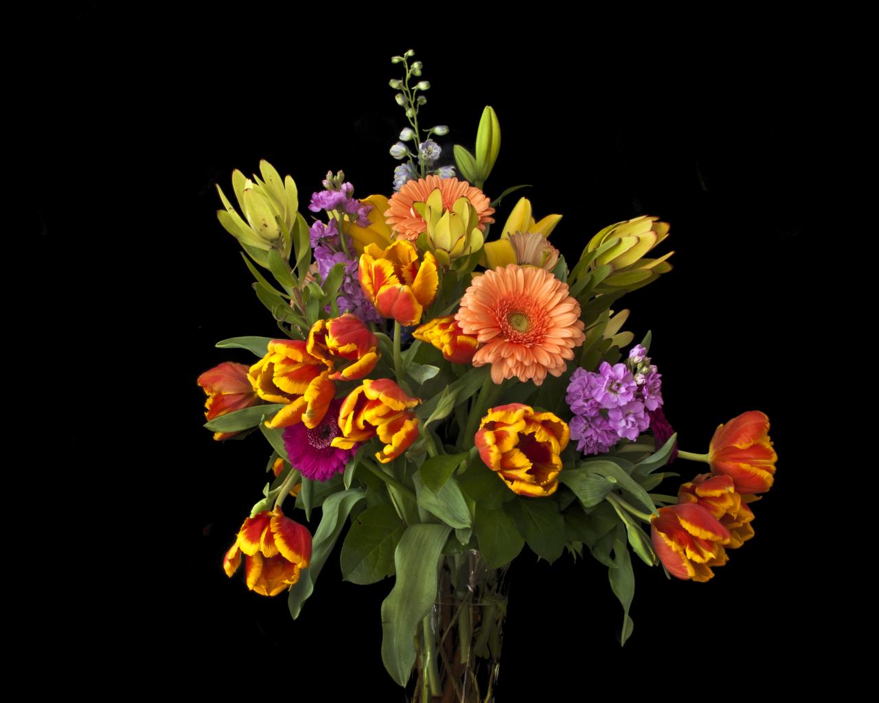 Обои Букет тюльпанов с цветами герберы на черном фоне