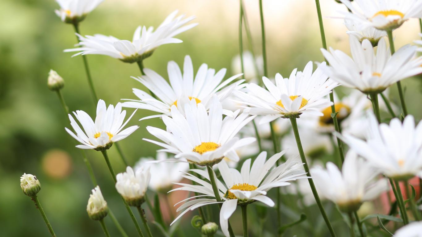 Обои Много белых ромашек с желтой серединкой крупным планом