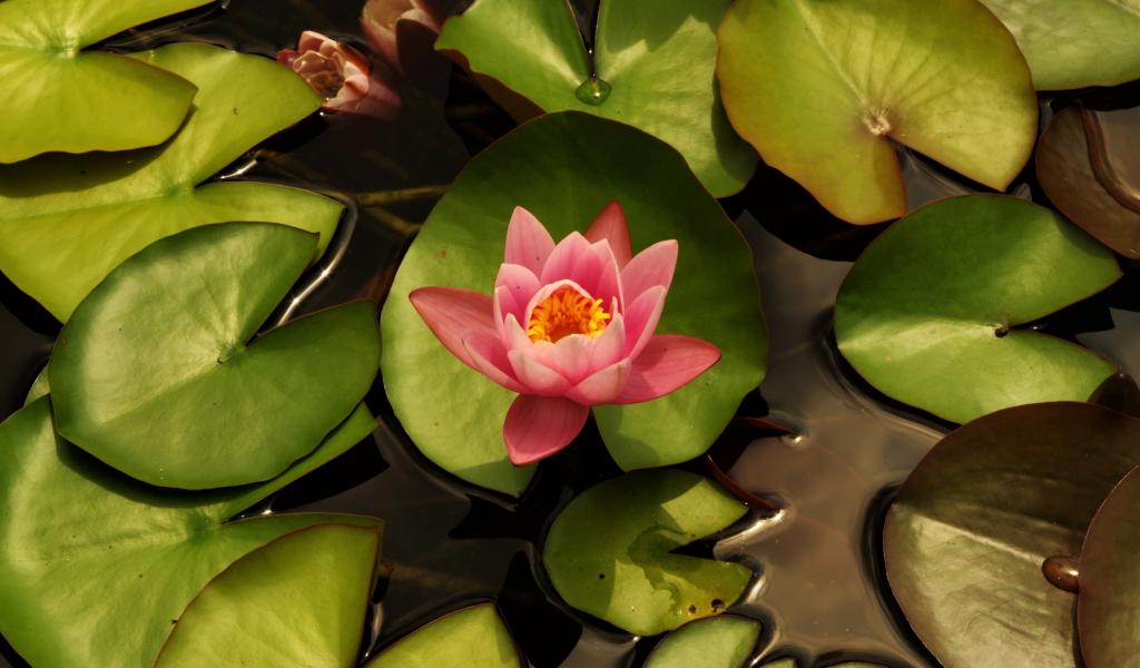 Обои Нежный розовый цветок лотоса с зелеными листьями в воде