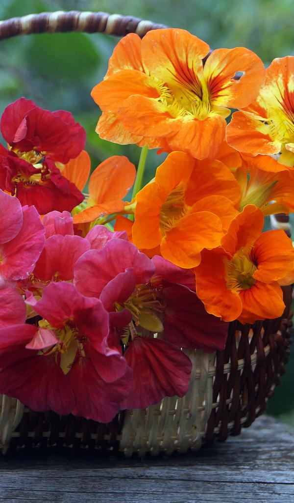 Обои Розовые и оранжевые цветы настурция в корзине