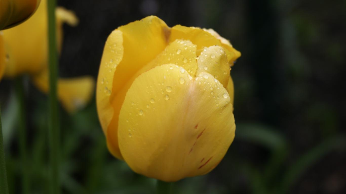 Обои Желтый цветок тюльпана в каплях росы крупным планом
