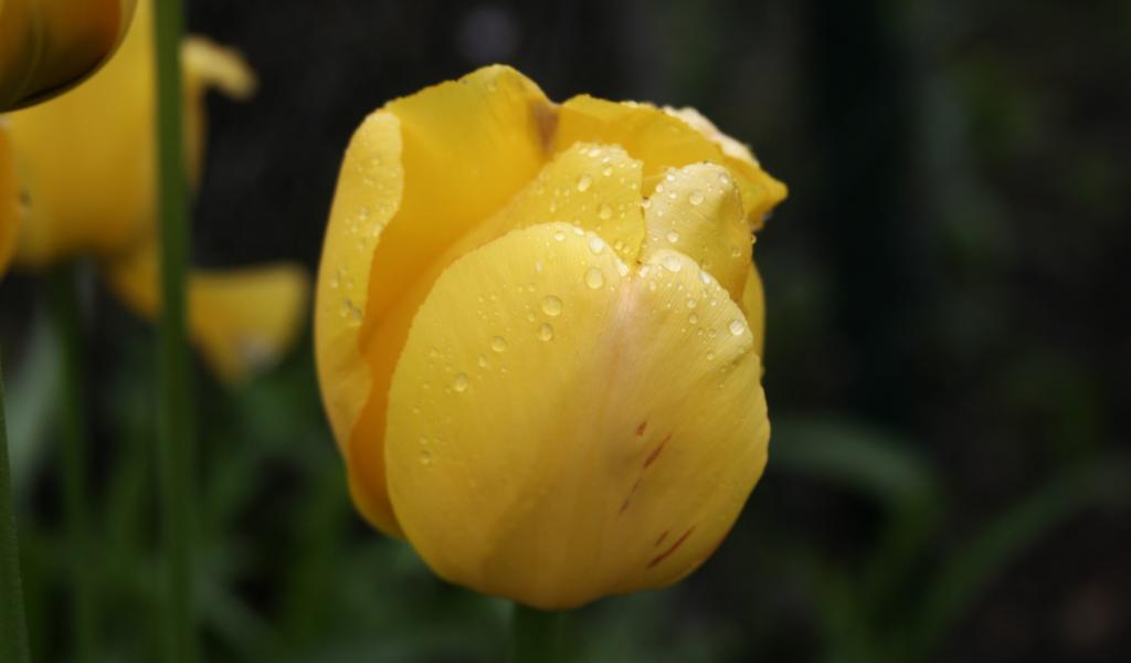 Обои Желтый цветок тюльпана в каплях росы крупным планом