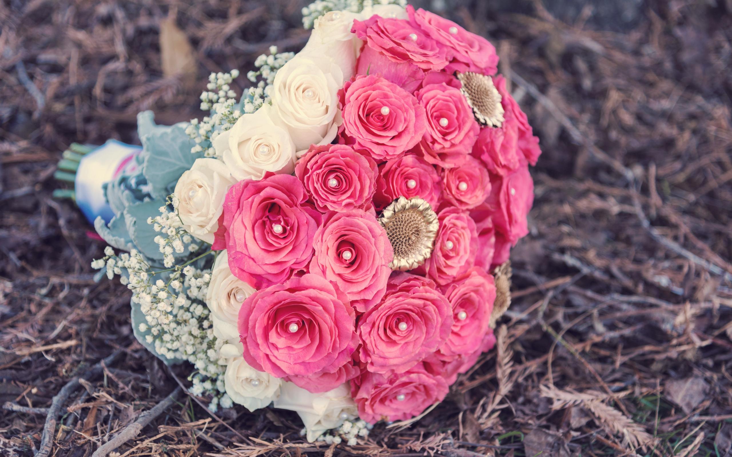 Обои Красивый букет из розовых и белых роз с бусинами