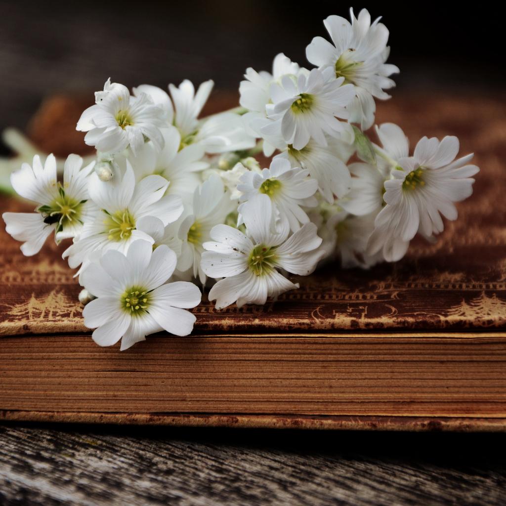 Обои Букет белых нежных цветов на старой книге