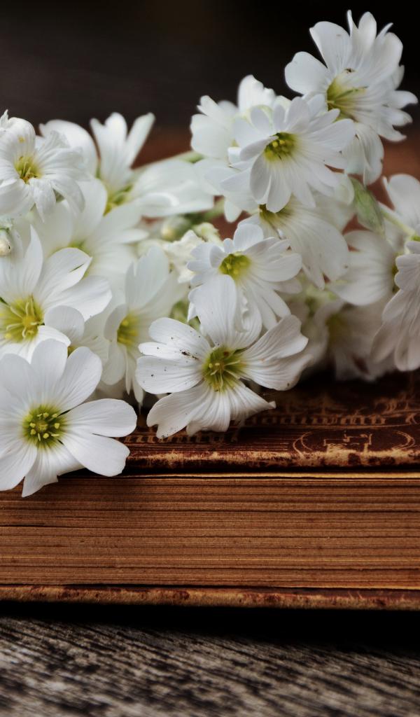 Обои Букет белых нежных цветов на старой книге