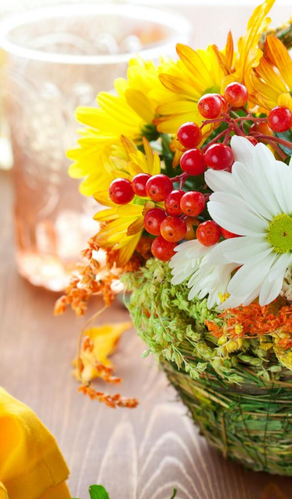 Обои Цветы хризантемы в корзине с ягодами калины
