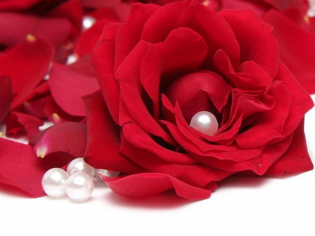 Обои Красная роза на белом фоне с лепестками и жемчужинами