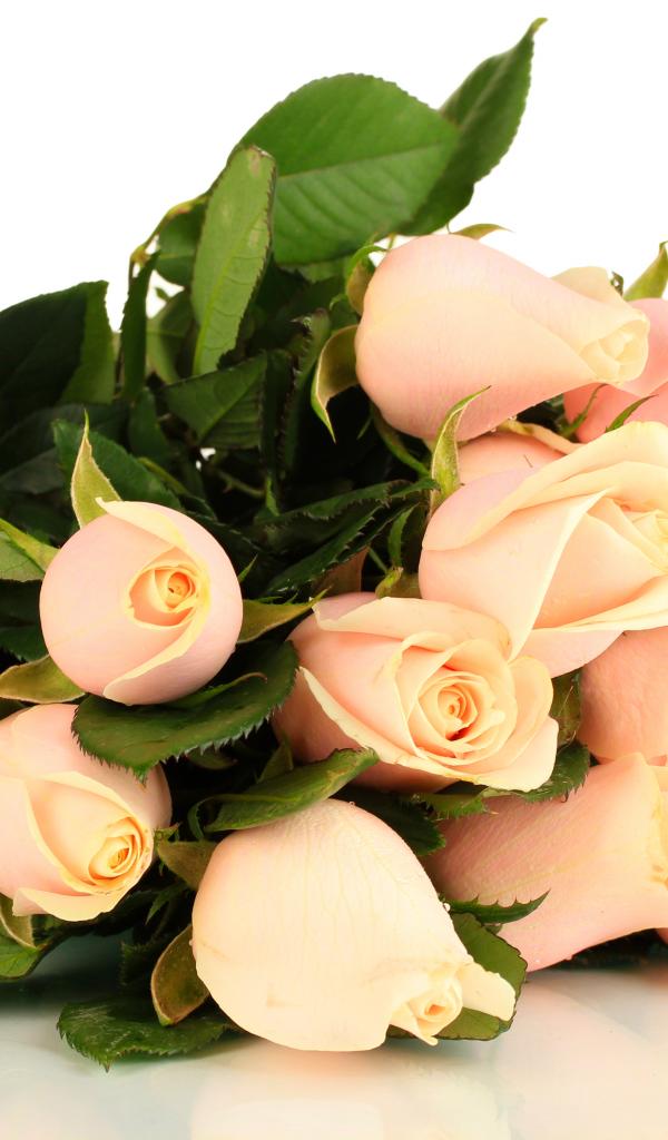 Обои Красивые розовые розы с зелеными листьями на белом фоне