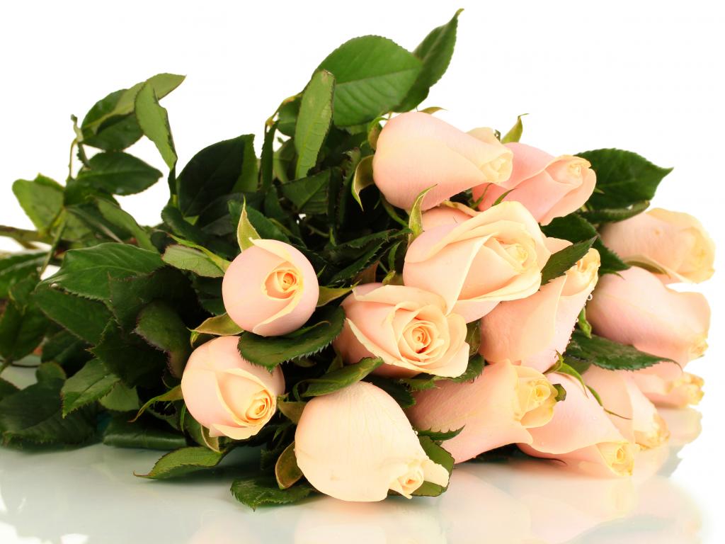 Обои Красивые розовые розы с зелеными листьями на белом фоне