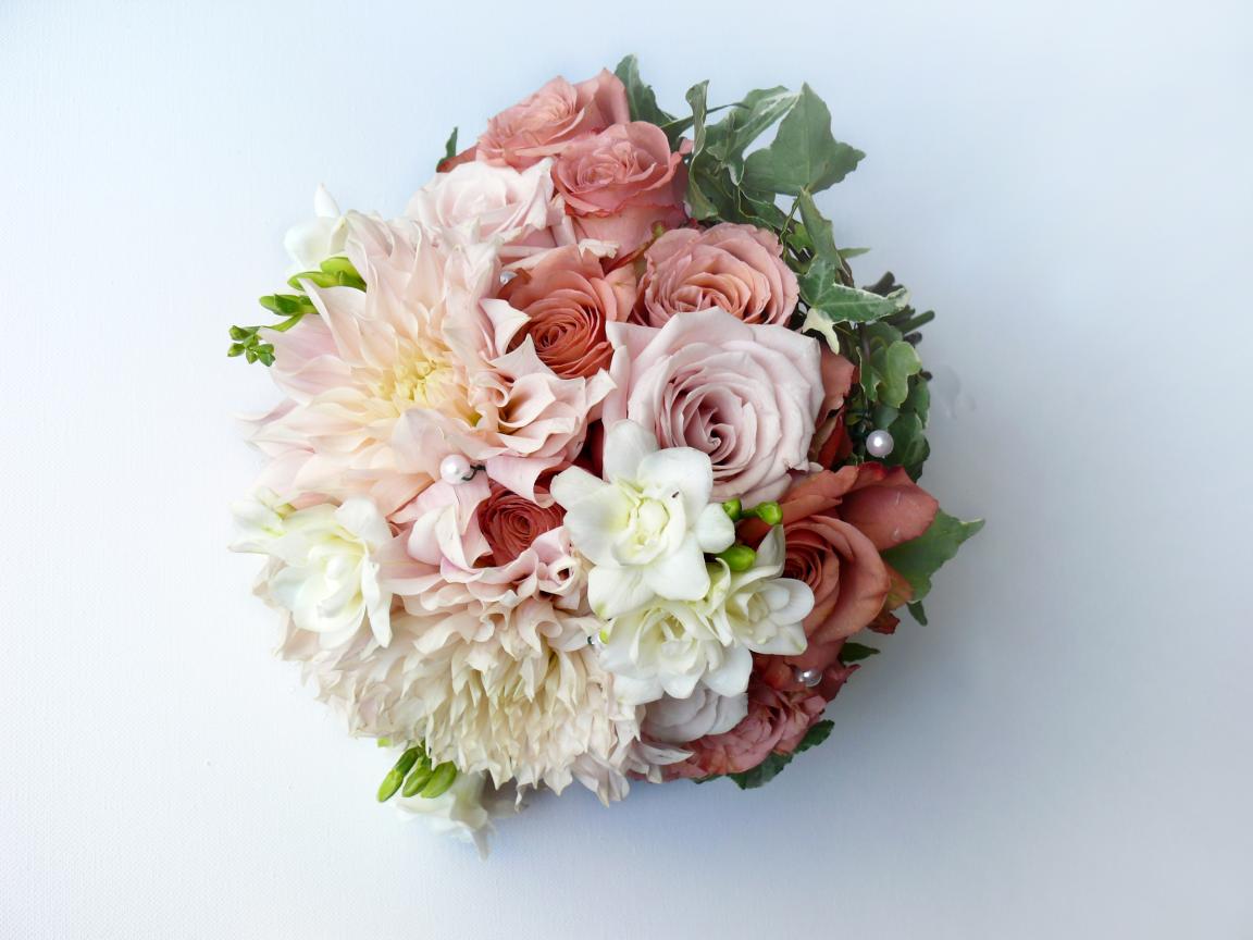 Обои Букет с цветами роз и георгин на сером фоне