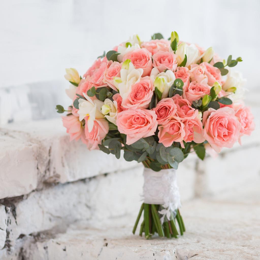 Обои Букет с цветами розовых роз и белых цветов фрезии