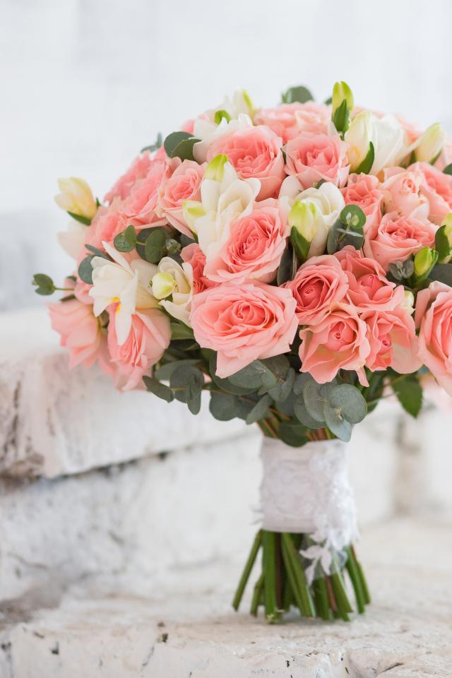 Обои Букет с цветами розовых роз и белых цветов фрезии