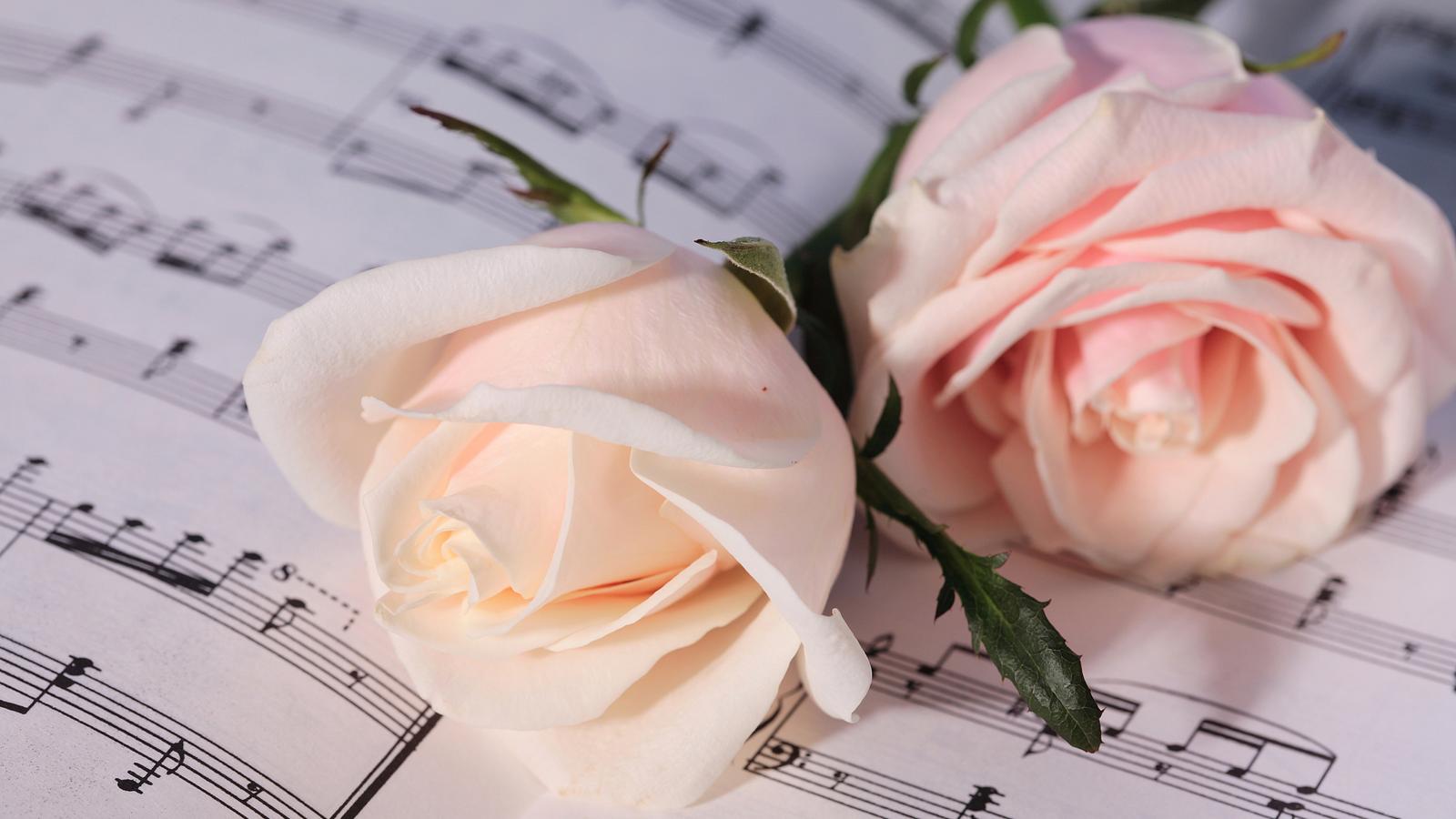 Обои Две нежные розовые розы лежат на нотах