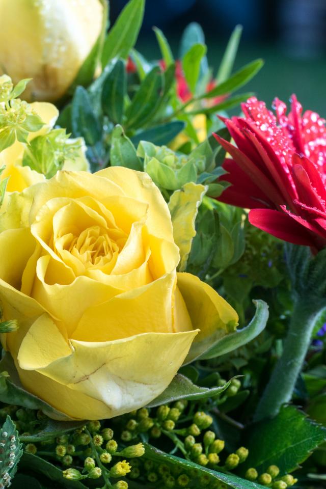 Обои Букет желтых роз с красными цветами герберы